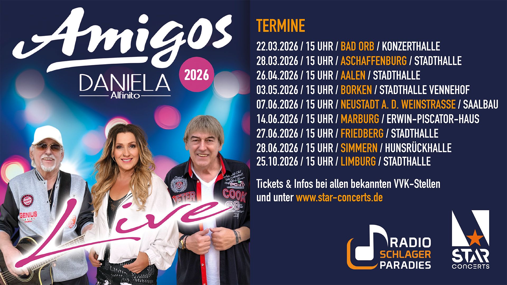 Amigos & Daniela Alfinito live Erleben Sie ein Feuerwerk der Gefühle! Mit alten, neuen und brandneuen Songs feiern sie gemeinsam den deutschen...